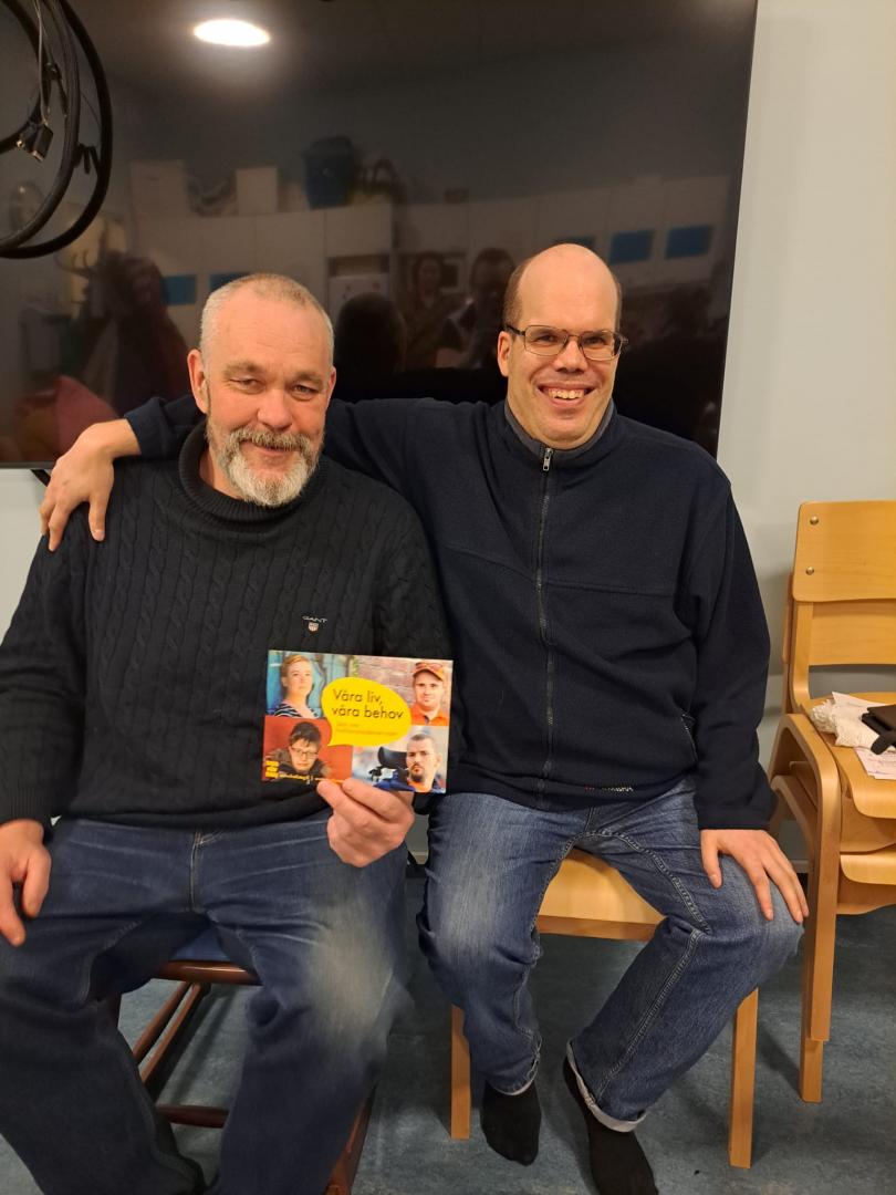 Jan "Bambu" Eriksson (SFP) stöder vår kampanj om att inte skära ner i funktionshinderservicen. Med på bilden är även Mats Nordström från Steg för Steg i Pargas.