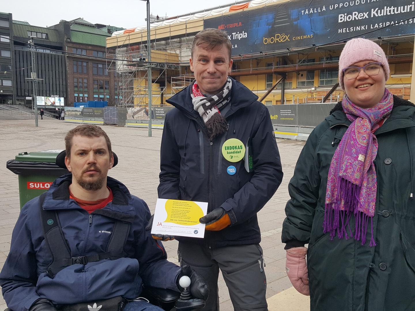 Oula Silvennoinen (Gröna) stöder vår kampanj om att inte skära ner i funktionshinderservicen. Med på bilden är även Mikaela Kinnunen och Jonas Bergholm från Steg för Steg i Helsingfors.