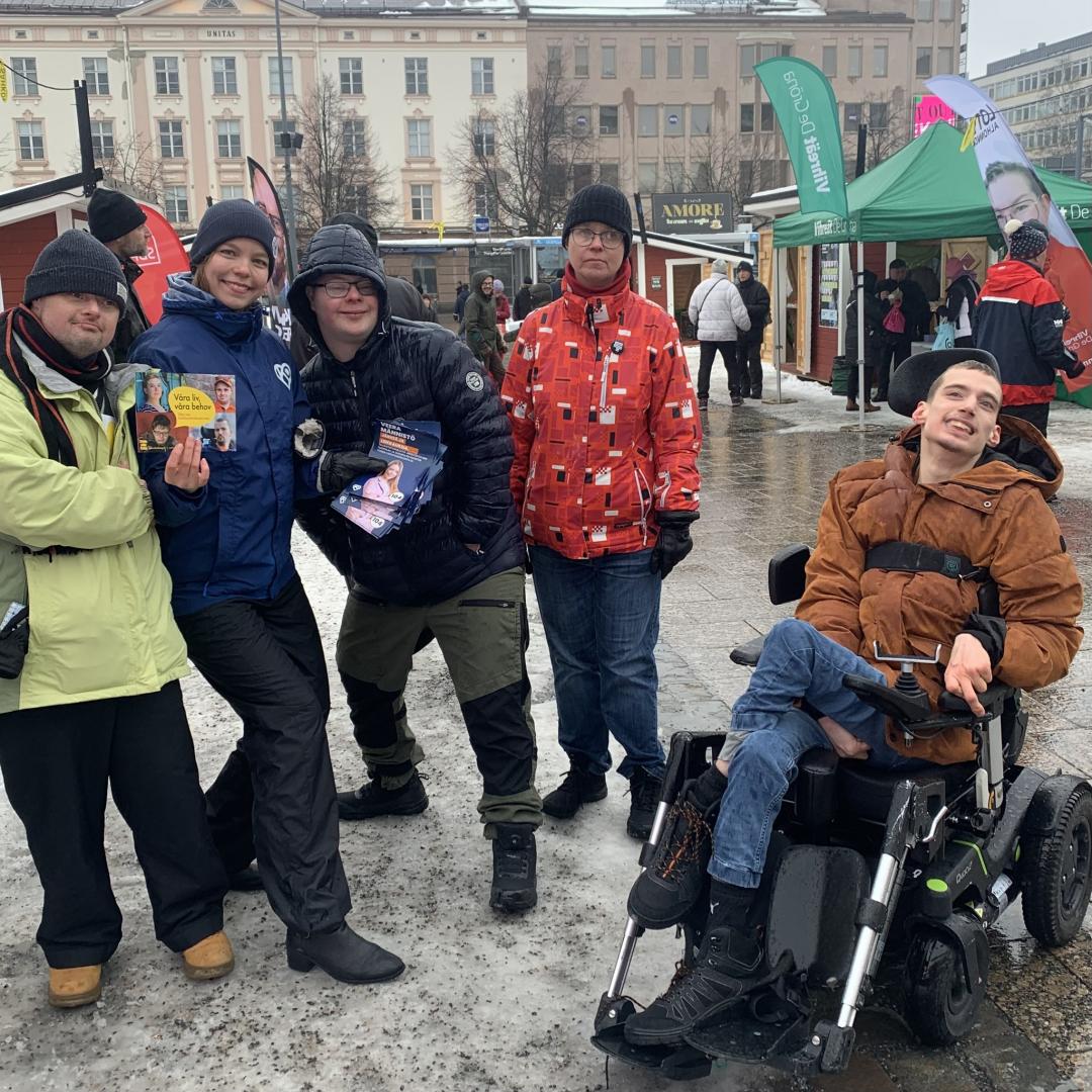 Veera Männistö (KD) stöder vår kampanj om att inte skära ner i funktionshinderservicen. Med på bilden är även Toni Sparv, Tom Wickström, Pia Björklund och Tobias Ståhlberg från Steg för Steg i Vasa.