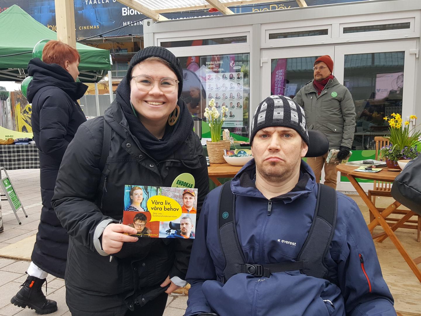 Kaapo Haapanen (Gröna) stöder vår kampanj om att inte skära ner i funktionshinderservicen. Med på bilden är även Jonas Bergholm från Steg för Steg.Läs mera »