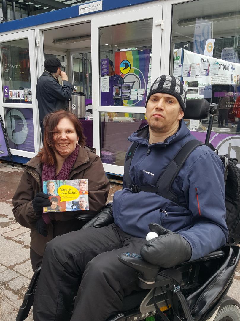 Reetta Ojala (Piratpartiet) stöder vår kampanj om att inte skära ner i funktionshinderservicen. Med på bilden är även Jonas Bergholm från Steg för Steg.