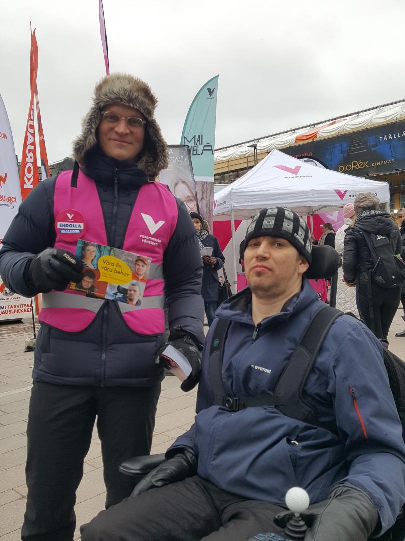 Riku Nieminen (VF) stöder vår kampanj om att inte skära ner i funktionshinderservicen. Med på bilden är även Jonas Bergholm från Steg för Steg.