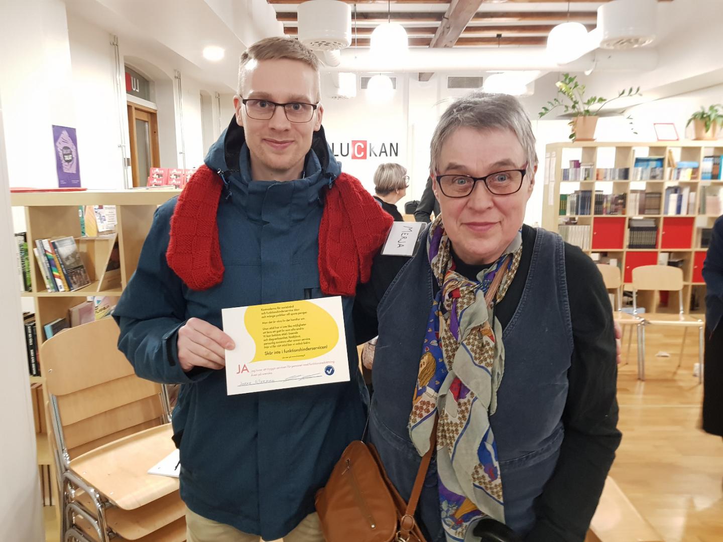 Kjell Wennström (SFP) stöder vår kampanj om att inte skära ner i funktionshinderservicen. Med på bilden är även Merja Ullner från Steg för Steg i Åbo.Läs mera »