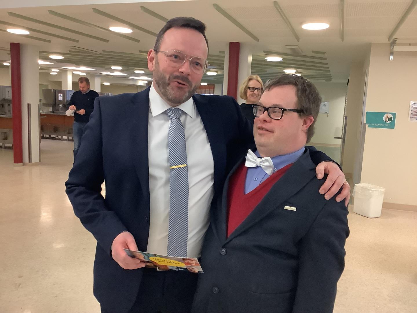Joacim Sandbacka (SFP) stöder vår kampanj om att inte skära ner i funktionshinderservicen. Med på bilden är även Jonas Jansson från Steg för Steg i Jakobstad.