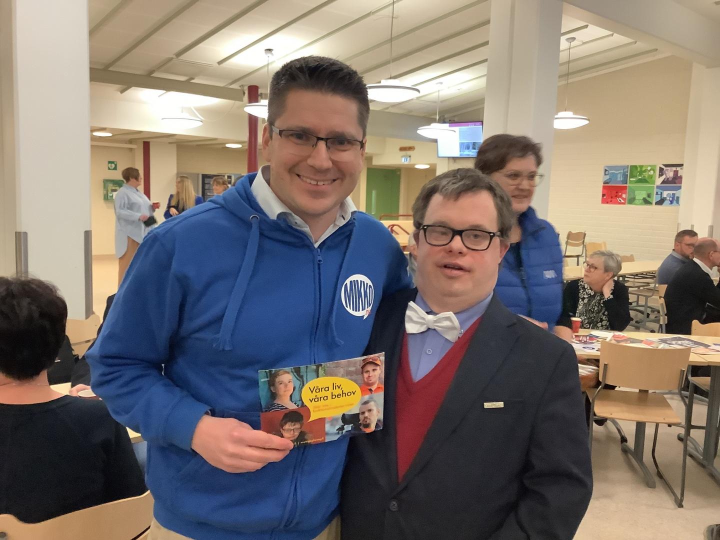 Mikko Ollikainen (SFP) stöder vår kampanj om att inte skära ner i funktionshinderservicen. Med på bilden är även Jonas Jansson från Steg för Steg i Jakobstad.