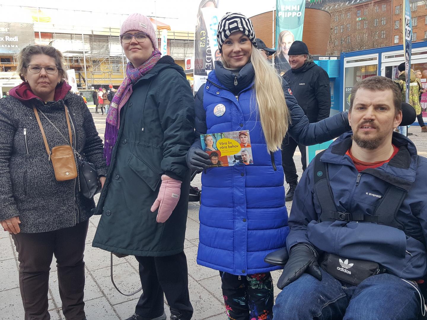 Mirita Saxberg (Samlingspartiet) stöder vår kampanj om att inte skära ner i funktionshinderservicen. Med på bilden är även Isa Moisio, Mikaela Kinnunen och Jonas Bergholm från Steg för Steg i Helsingfors.
