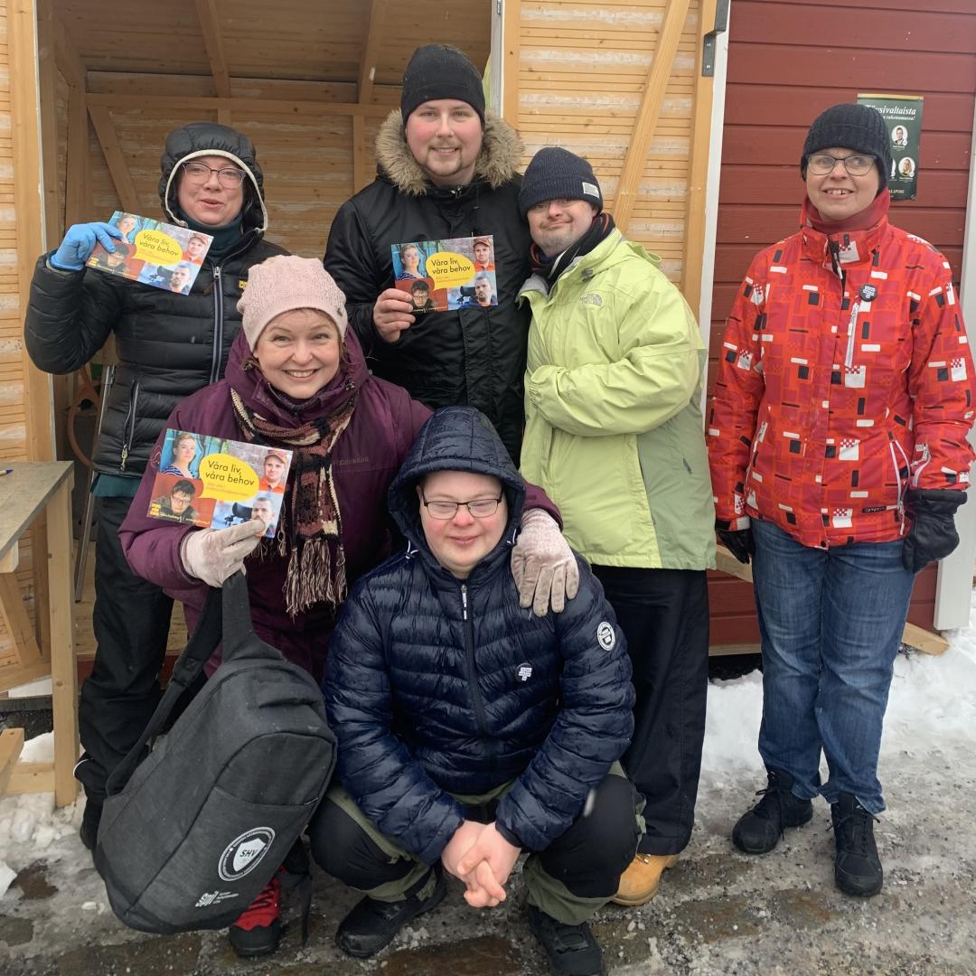 Vera Stålberg, Anne Nivukosi och Jani Ekström (Makten tillhör folket) stöder vår kampanj om att inte skära ner i funktionshinderservicen. Med på bilden är även Pia Björklund, Toni Sparv och Tom Wickström från Steg för Steg i Vasa.
