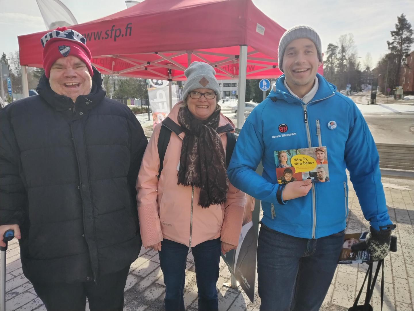 Hernik Wickström (SFP) stöder vår kampanj om att inte skära ner i funktionshinderservicen. Med på bilden är även Niclas Jansson och Daniela Frankenhaeuser från Steg för Steg i Grankulla.